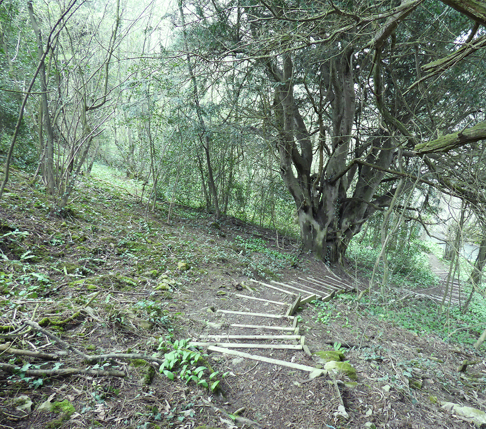 Steep forest steps leading past some impressive old yew trees.